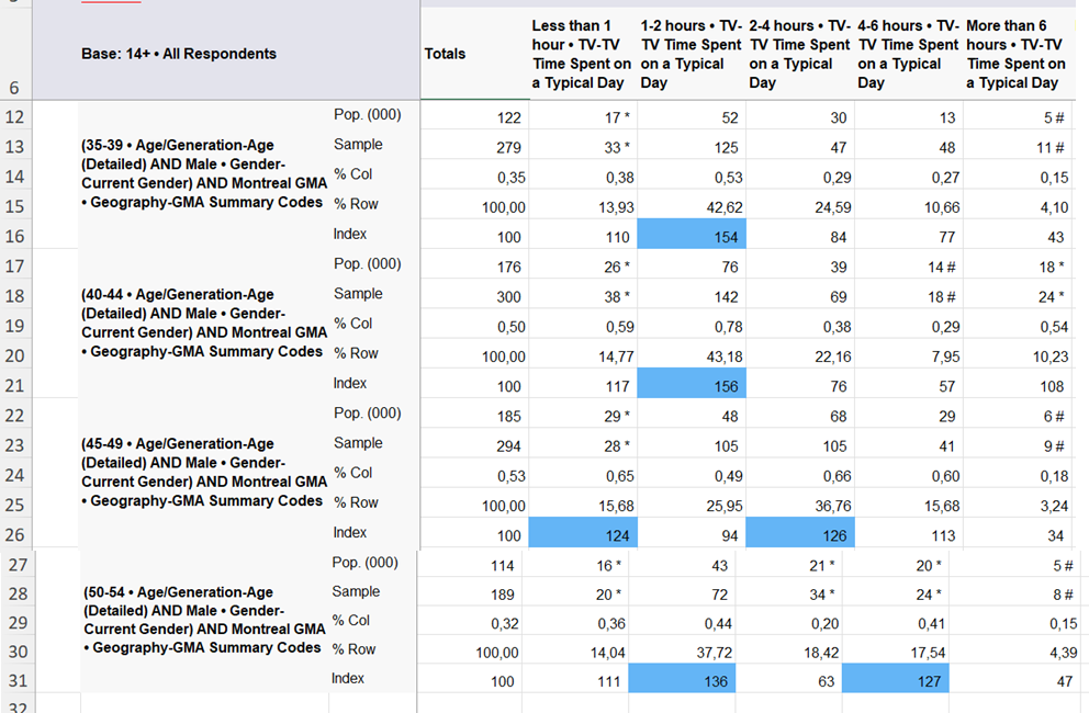 Les données de Vividata indiquent que les hommes âgés de 40 à 44 ans résidant dans la région de Montréal présentent l’indice le plus élevé pour un temps de visionnement de télévision de 1 à 2 heures par jour (index 156). Cela veut dire qu’ils consomment davantage de télévision que la moyenne, ce qui les rend particulièrement susceptibles d’être exposés à une publicité télévisée comme la campagne Bell Let’s Talk.